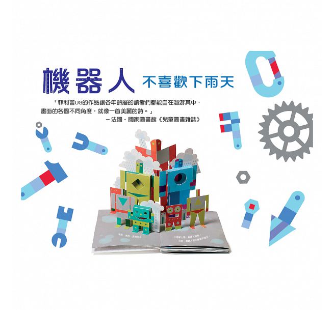 一本淘氣、愉快的立體故事書,令親子們愛不釋手!翻開來,每一頁怦然躍出、展開的畫面,帶讀者隨著淋雨而感冒的機器人駕車在路上飛馳,看看巧手的醫生將吱嘎作響的齒輪固定好,鬆脫的螺絲也旋緊,機器人經過一番治療,完好如新,而且更加強壯了!