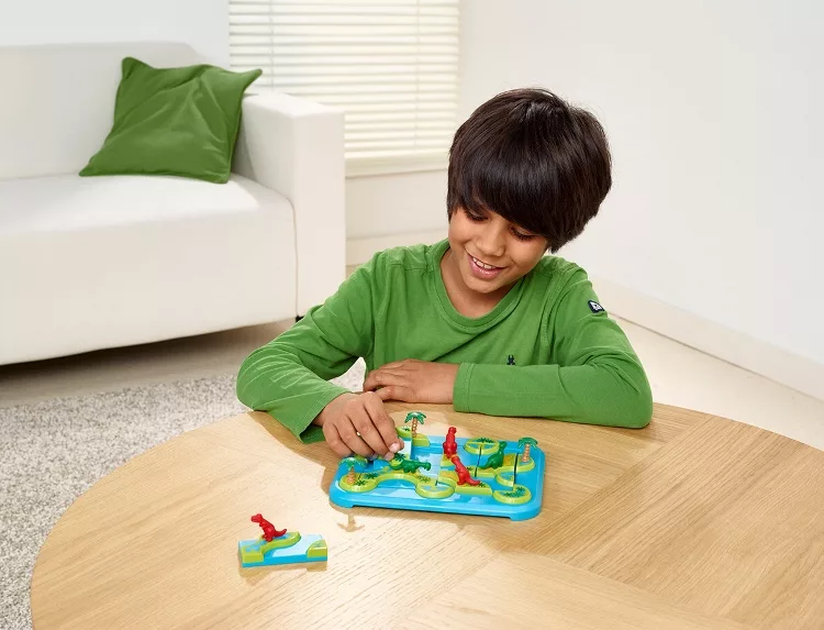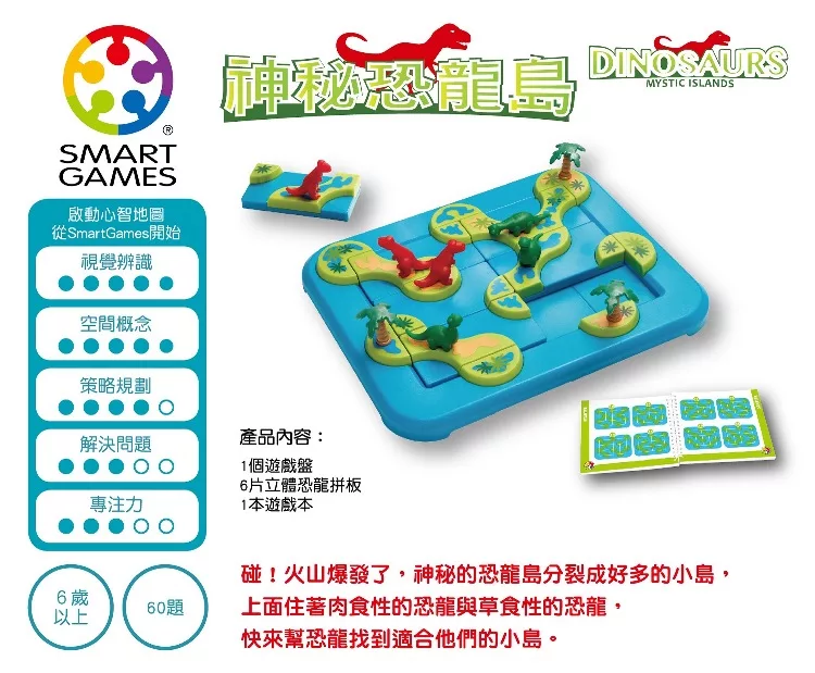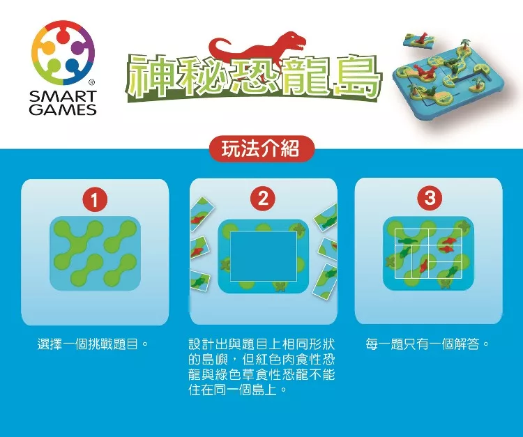 3D立體可愛的恐龍與精緻的小島設計,透過肉食性恐龍(紅色)與草食性恐龍(綠色)不能居住在同一個小島上的規則,依據邊框上的線索排出適合恐龍居住的小島。玩家要設法規劃小島的區域,讓同一類的恐龍居住在一起,搭配60個遊戲關卡,由淺入深,培養空間位置概念並增進解決問題的能力。