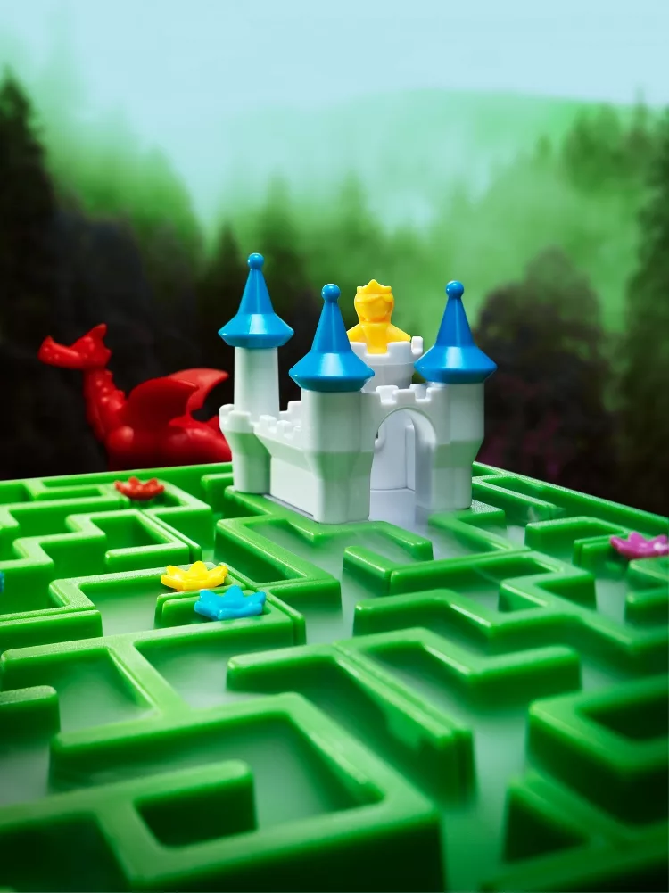 以經典童話「睡美人」為情境,噴火龍、睡美人公主、騎士王子與城堡,設計成富變化的迷宮遊戲,加入噴火龍,挑戰性與趣味性再提升,讓孩子循序漸進提升空間概念。